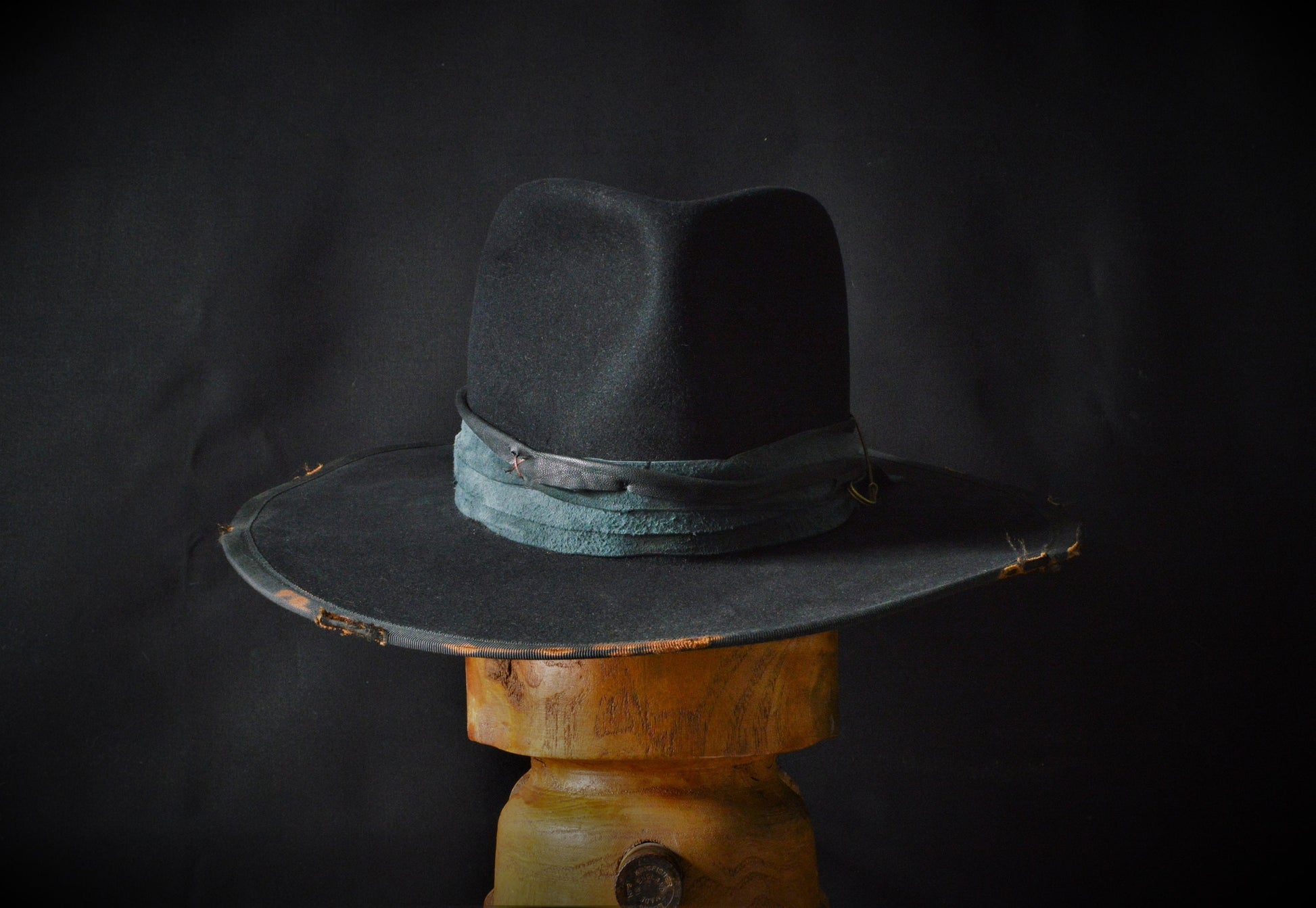 Distressed extra wide brimmed fedora, with mishaped brim, for that beaten up look.