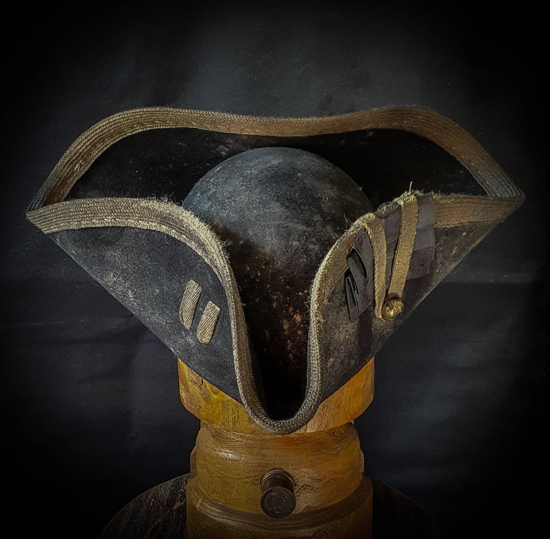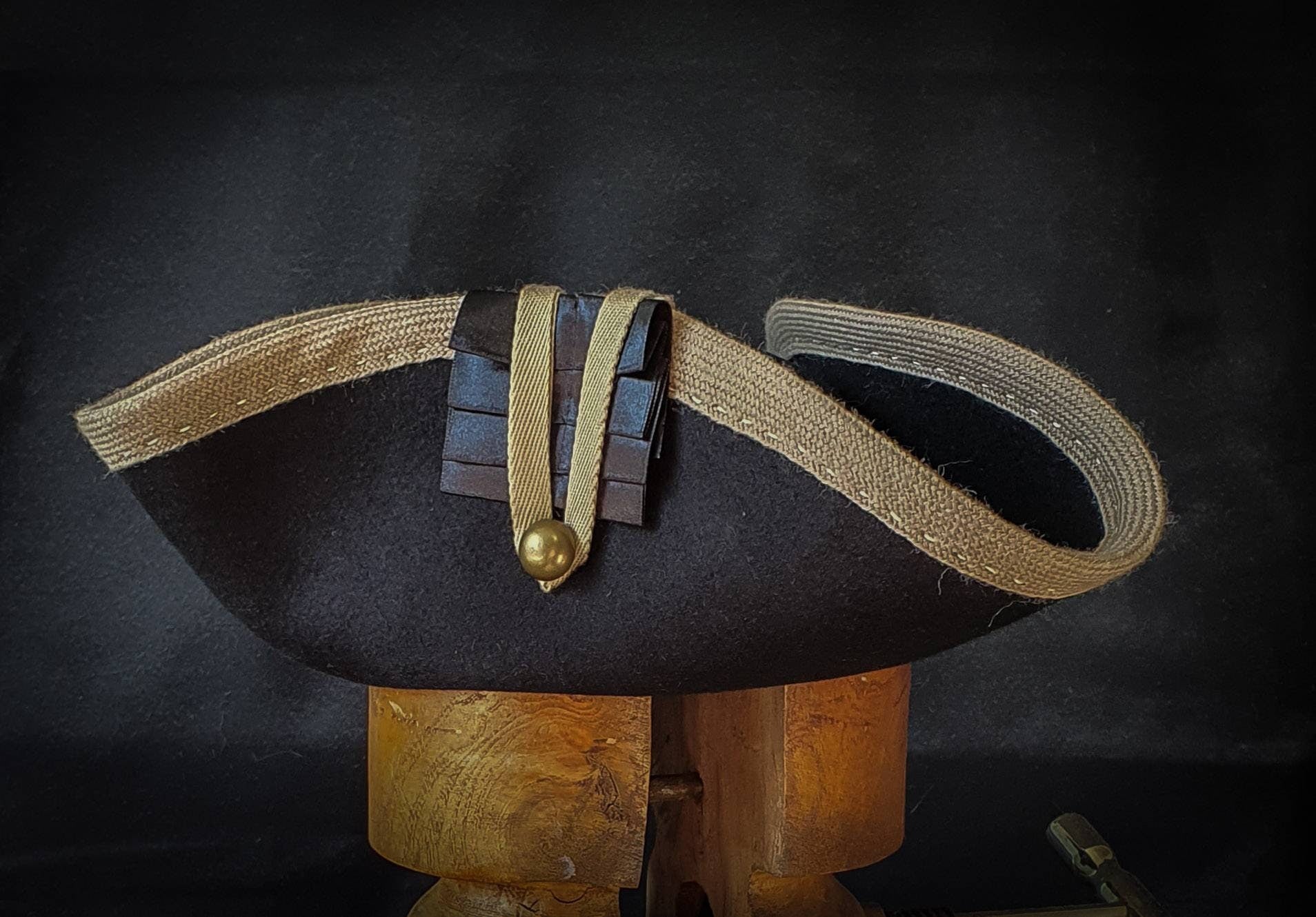 A classic red coat cocked hat, also called a tricorn hat. All hand sewn for authenticity